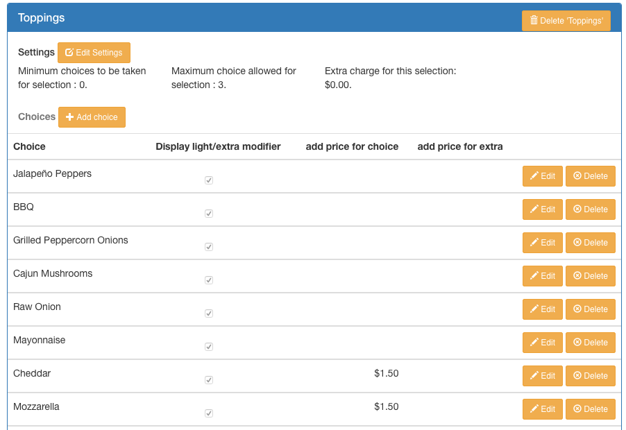 Powerful pricing engine allows you to specify maximum number of choices allowed and extra charges for special selections. Pizza style half-side selections are also supported, wherein choices can be made only for the left or right side.